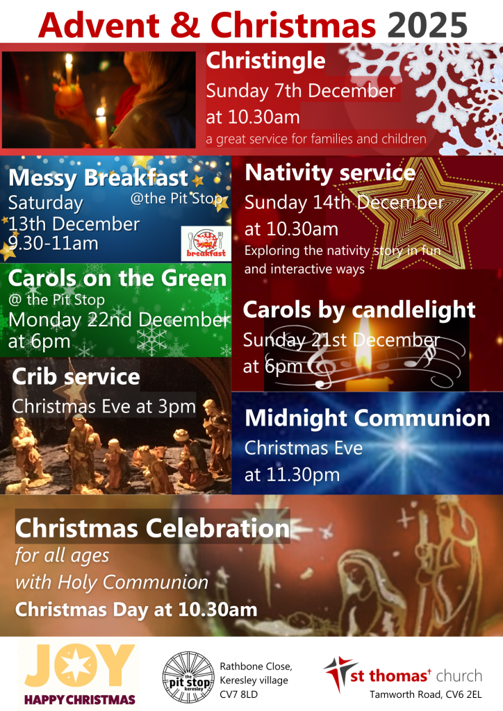Worship & PrayerCome to church or watch onlineRefreshment GroupTuesdays 1.30pm-2.30pm Tea, Friendship, FaithPray at homeresources to help youWatch previous services Faith Find services, events and resources to help you meet with God. discover more → For All Ages Groups & Activities for all ages. discover more → Fellowship Meet, talk and encourage each other online or in person. We're better together! discover more → Weddings Find out about getting married at St Thomas' Church discover more → Christenings Find out about having a baptism or thanksgiving service discover more → Bereavement See how St Thomas' can help you with funerals and bereavement. discover more → Our Centres St Thomas' Church The Pit Stop Church Hall Churchyard